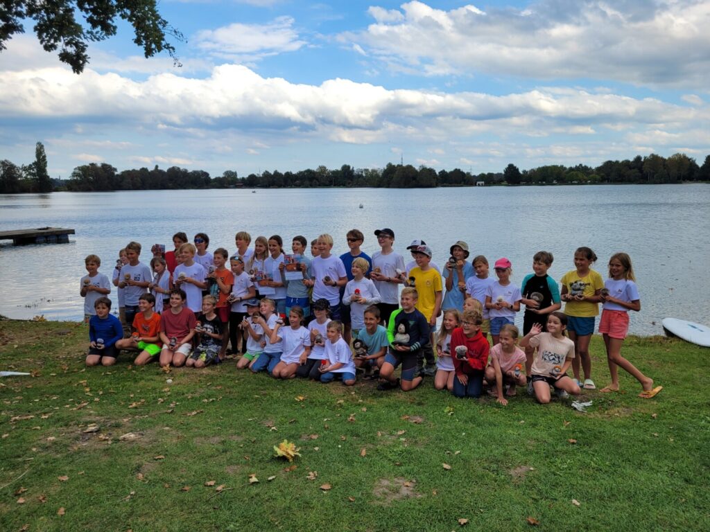 Das Wetter war eigentlich super – sonnig und warm – nur der Wind wollte nicht so richtig mitspielen. Am Samstag war es komplett windstill. An Segeln war da nicht zu denken, dafür hatten wir aber viel Spaß beim Baden im See. Ein Highlight war das große Foto mit allen Holzoptiseglern auf dem Wasser. Abends gab es noch einen Kinoabend , bei dem wir den Tag gemütlich ausklingen ließen.